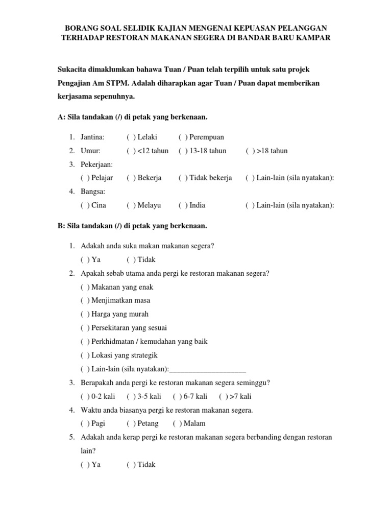 Borang Soal Selidik Kajian Mengenai Kepuasan Pelanggan Terhadap Restoran Makanan Segera Di Bandar Baru Kampar from imgv2-1-f.scribdassets.com Tahap kepuasan pelanggan terhadap perkhidmatan di janm bahagian c : Antara objektif penyelidikan ini ialah. Borang soal selidik kajian kepuasan pelanggan pejabat setiausaha kerajaan negeri sembilan darul khusus tahun 2013 a. For more information and source, see on this link : For more information and source, see on this link : Pdf tahap kepuasan pelanggan terhadap kualiti perkhidmatan pengangkutan awam di kuis. Soal selidik ini bertujuan untuk mendapatkan maklumat yang diperlukan bagi menilai keberkesanan mbsp dalam memberi perkhidmatan yang berkualiti. Kertas kerja kuantitatif ini menganalisa tahap kepuasan pelajar terhadap perkhidmatan makanan di kafetaria kuis.