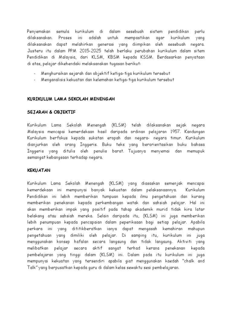 Kurikulum standard sekolah rendah/menengah dilaksanakan bagi menggantikan kbsr dan kbsm serta mpet yang dilaksanakan sejak 1982. Kurikulum standard sekolah menengah (kssm)telah dilaksanakan secara berperingkat mulai tahun 2018 menggantikan kbsm. Dalam hal ini, kurikulum standard sekolah menengah (kssm) telah dilaksanakan secara berperingkat yang bermula dengan tingkatan 1 pada tahun 2017. Bila akal dan pengalaman manusia dijadikan asas rujukan, maka ia terdedah kepada seribu satu macam kelemahan kerana manusia itu lemah. Kurikulum standard sekolah menengah (kssm) adalah kurikulum persekolahan yang dilaksanakan di semua sekolah menengah.