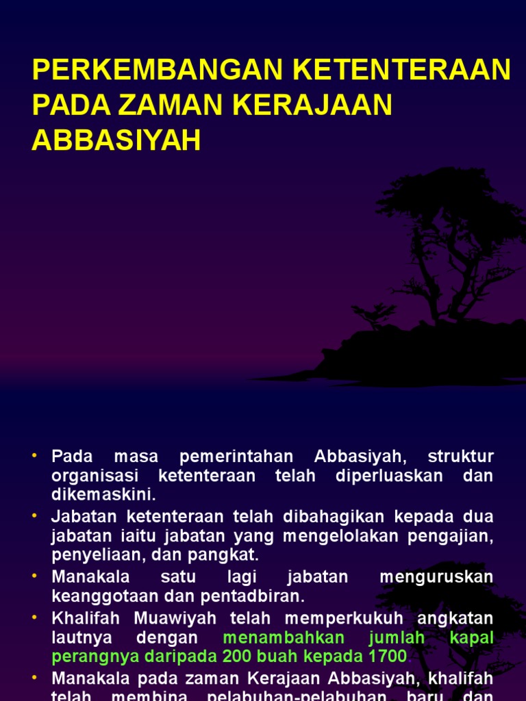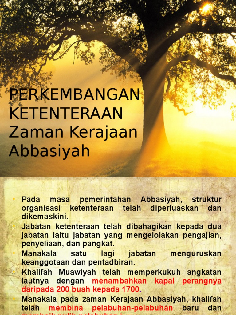 Pel 24 Perkembangan Ketenteraan Pada Zaman Kerajaan Abbasiyah from img.pdfslide.net Dalam pentadbiran abbasiyah, beberapa jabatan telah ditubuhkan seperti jabatan akaun, jabatan cukai, jabatan pos dan sebagainya. Muhammad ibni ali, cicit kepada saidina abbas menjalankan kempen untuk mengembalikan kuasa pemerintahan kepada keluarga bani hashim di parsi semasa pemerintahan khalifah umar bin abdul aziz. See full list on ms.wikipedia.org Selepas itu, pemimpin bani abbasiyyah menjadi boneka sehingga khalifah mereka dimusnahkan sepenuhn. Bagi mengatasi masalah ini, kerajaan abbasiyyah memutuskan untuk mencipta sebuah unit angkatan tentera yang setia kepadanya yang kebanyakan datang daripada hamba berbangsa turki yang dikenali sebagai mamluk. See full list on ms.wikipedia.org Hulagu khan menyerang dan memusnahkan baghdad pada 10 februari 1258, menyebabkan kehilangan nyawa yang banyak. Pada masa ini, segala aspek pemerintahan dan p.